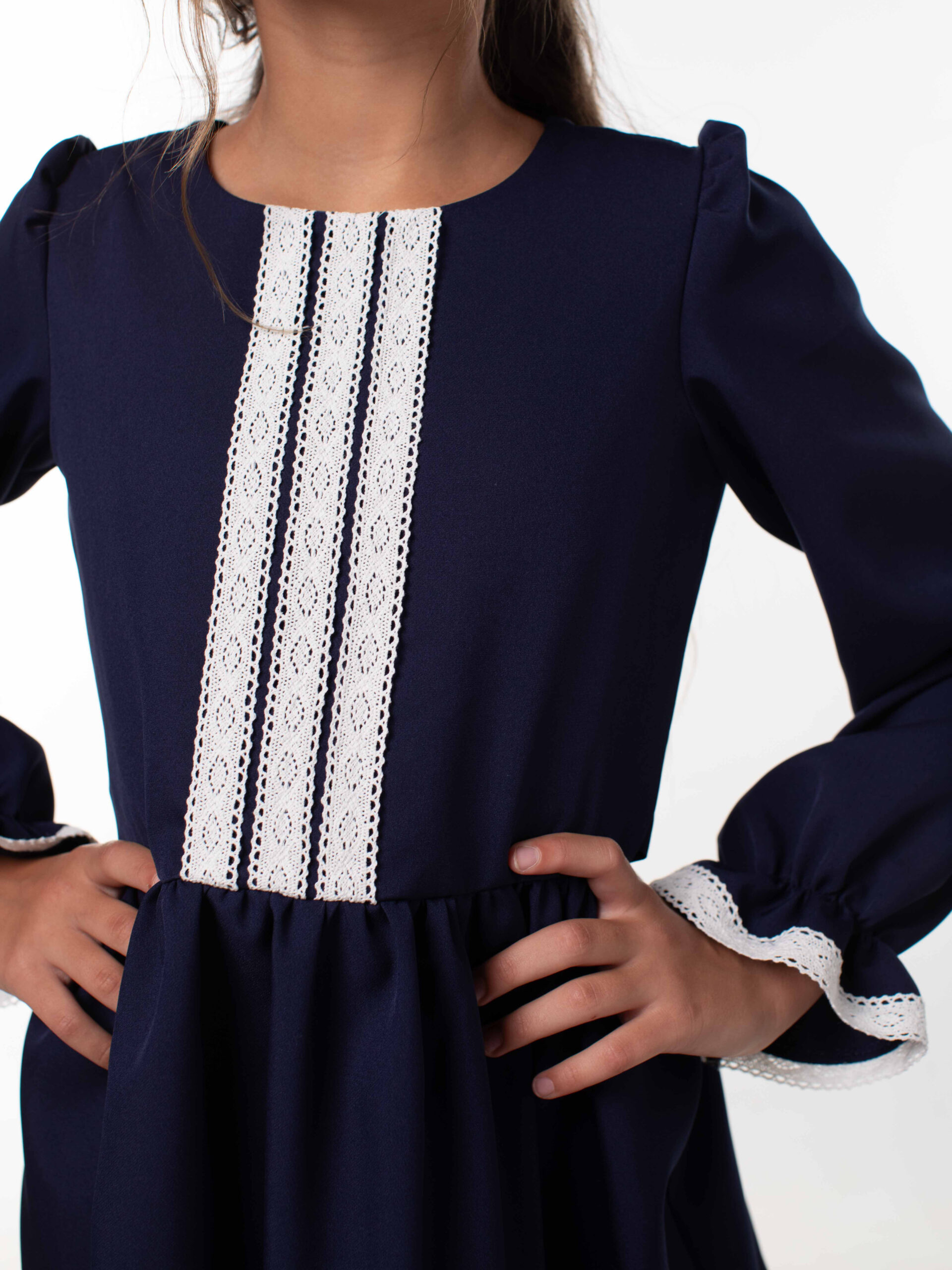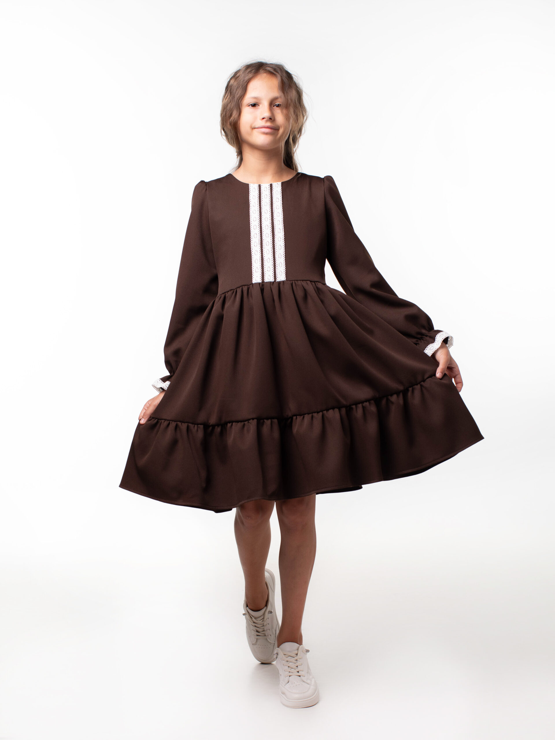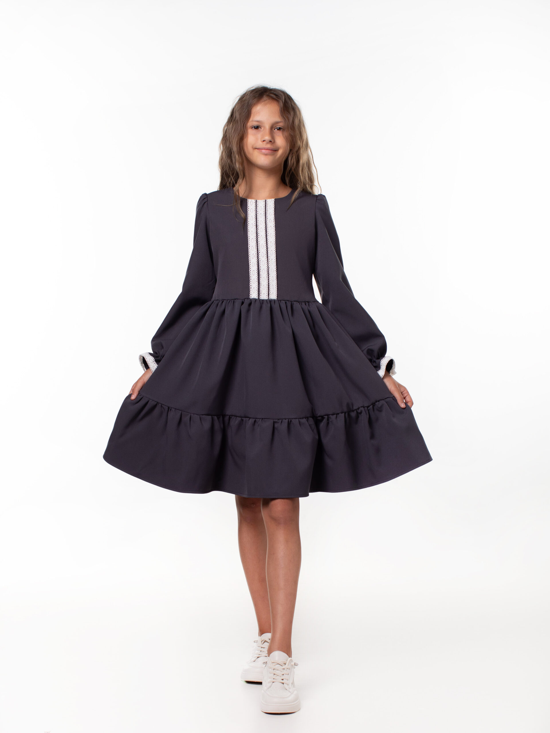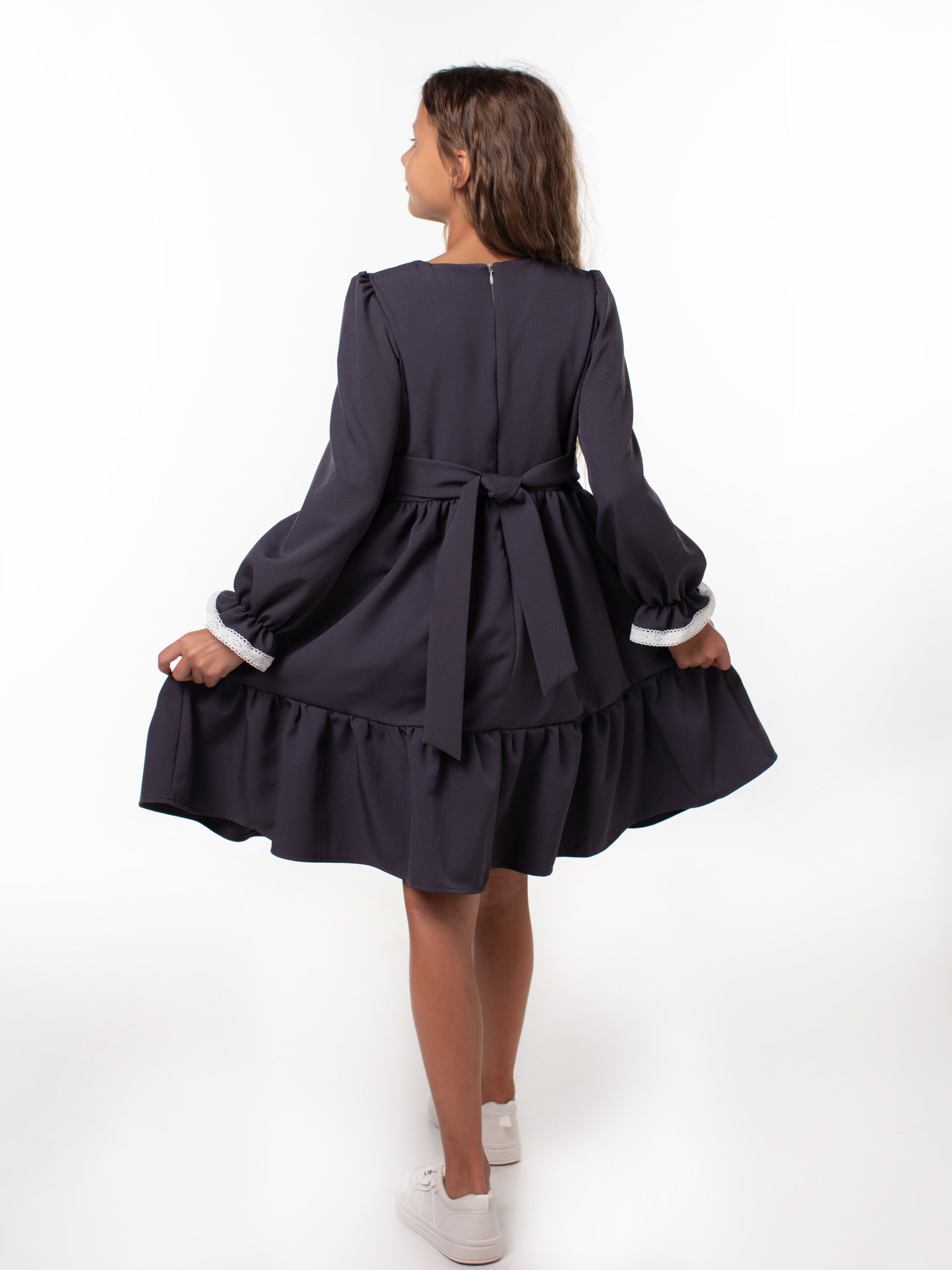 Платье школьное для девочек с длинным рукавом и воланами. На лиф и рукава платья настрочены кружева из натуральных нитей, которые являются украшением данной модели и её изюминкой. Лиф платья на подкладке из хлопка. Красивое и стильное с отрезным лифом для девочек из ткани барби. В этой модели пышная юбка и объемный волан, рукава собраны по окату и внизу вставлена мягкая резиночка, которая придает объем и получаются рукава-фонарики. Подходит для среднего роста, сзади на линии талии отлетной пояс, поэтому можно брать платье с запасом, Вы его отрегулируете по объему. Самое главное – оно невероятно кружится, его объем удивит Вас
