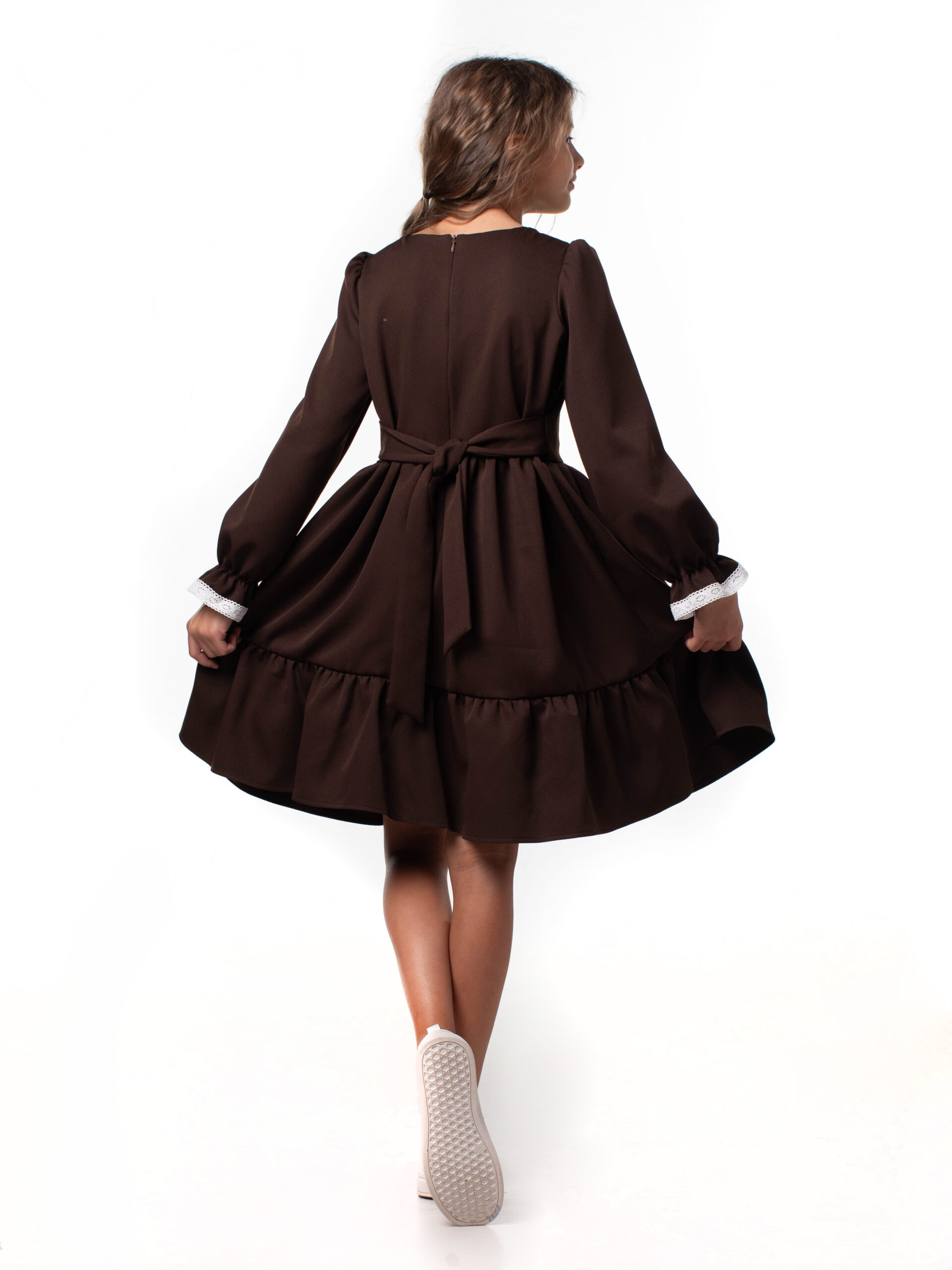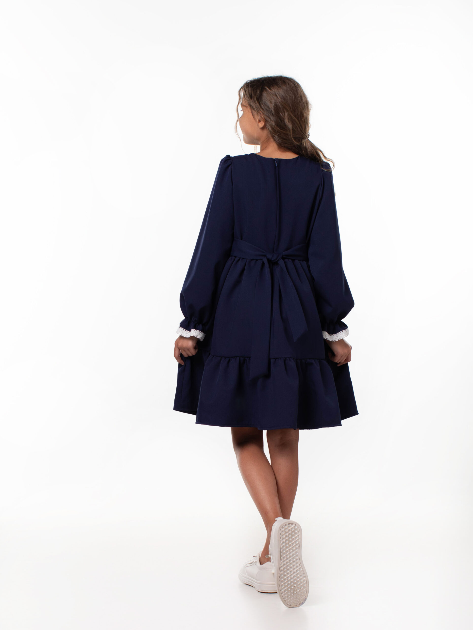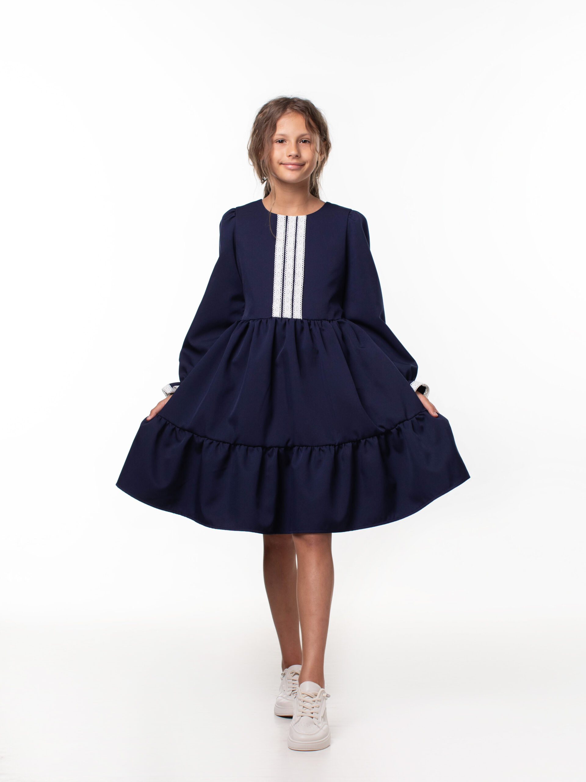 Платье школьное для девочек с длинным рукавом и воланами. На лиф и рукава платья настрочены кружева из натуральных нитей, которые являются украшением данной модели и её изюминкой. Лиф платья на подкладке из хлопка. Красивое и стильное с отрезным лифом для девочек из ткани барби. В этой модели пышная юбка и объемный волан, рукава собраны по окату и внизу вставлена мягкая резиночка, которая придает объем и получаются рукава-фонарики. Подходит для среднего роста, сзади на линии талии отлетной пояс, поэтому можно брать платье с запасом, Вы его отрегулируете по объему. Самое главное – оно невероятно кружится, его объем удивит Вас