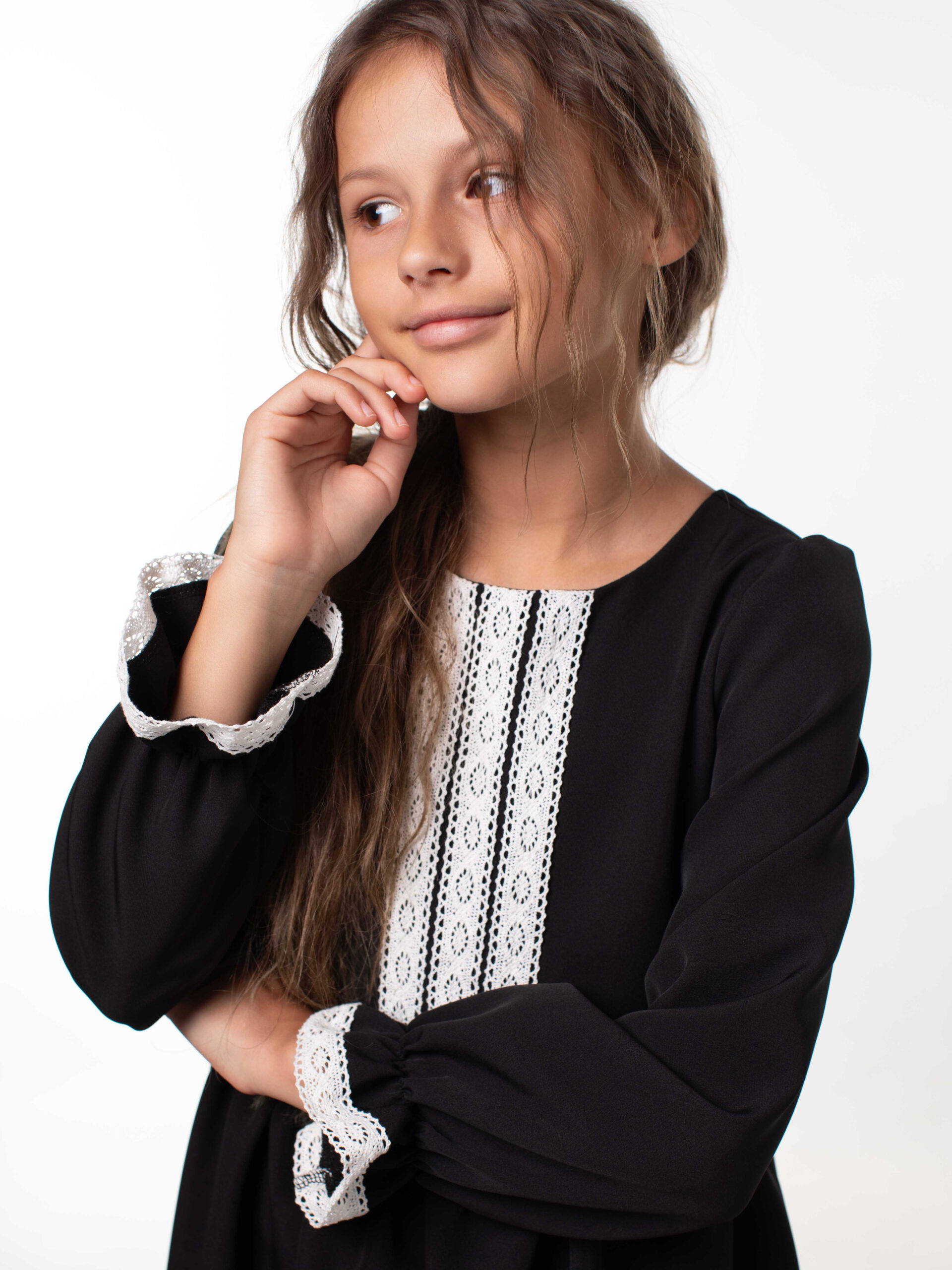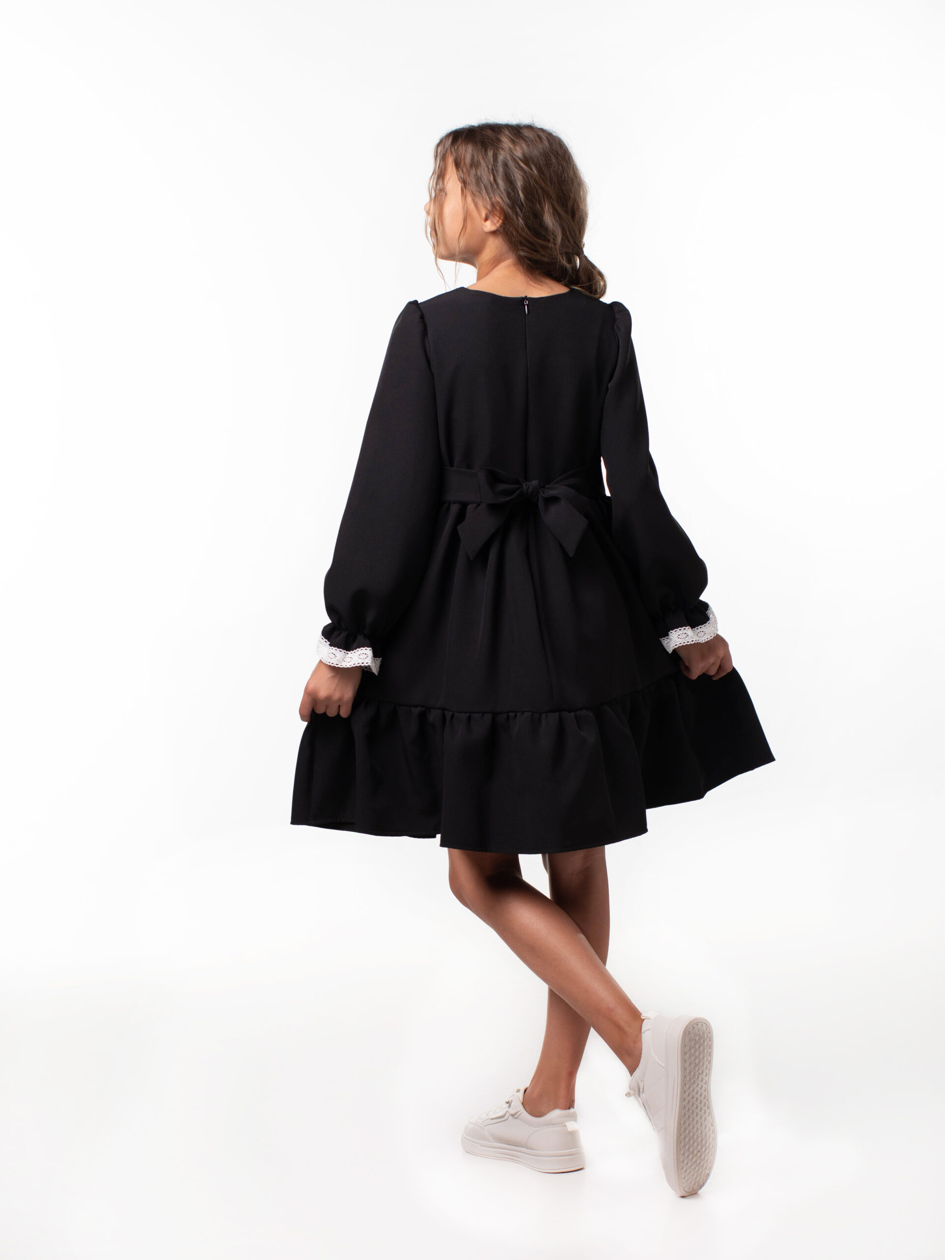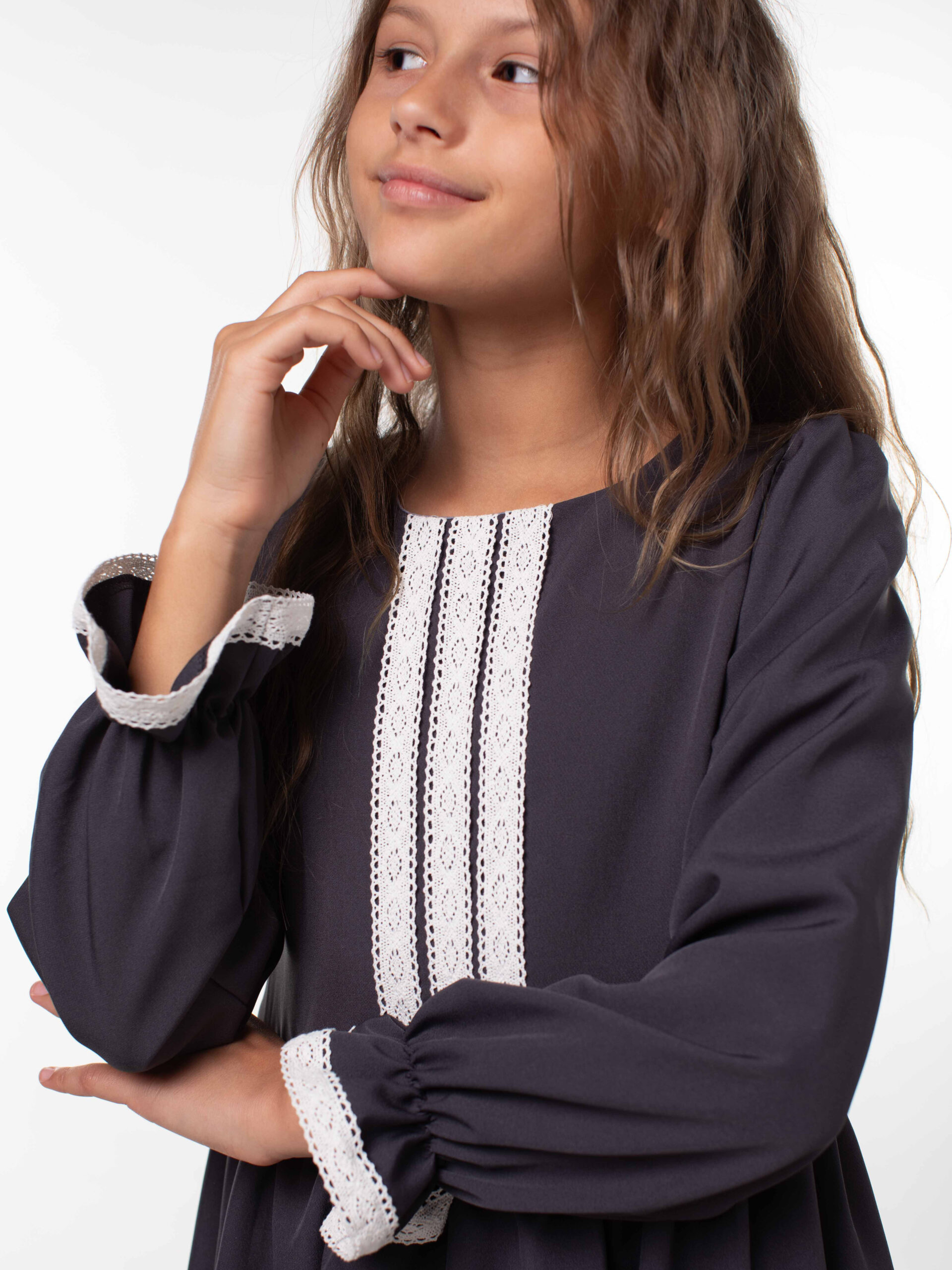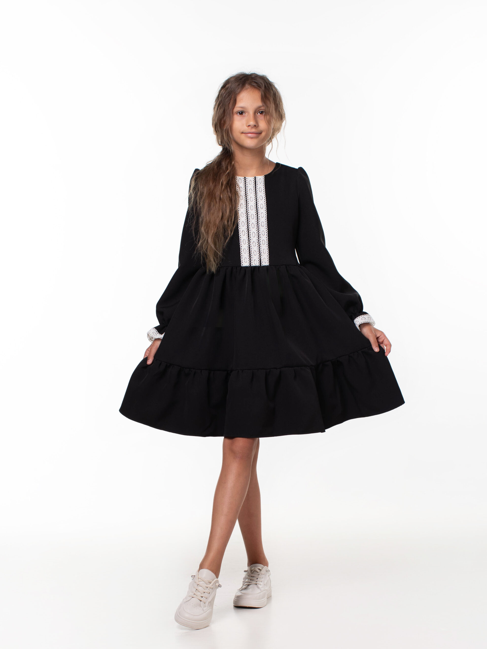 Платье школьное для девочек с длинным рукавом и воланами. На лиф и рукава платья настрочены кружева из натуральных нитей, которые являются украшением данной модели и её изюминкой. Лиф платья на подкладке из хлопка. Красивое и стильное с отрезным лифом для девочек из ткани барби. В этой модели пышная юбка и объемный волан, рукава собраны по окату и внизу вставлена мягкая резиночка, которая придает объем и получаются рукава-фонарики. Подходит для среднего роста, сзади на линии талии отлетной пояс, поэтому можно брать платье с запасом, Вы его отрегулируете по объему. Самое главное – оно невероятно кружится, его объем удивит Вас